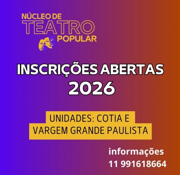 Estão abertas as inscrições para a turma de 2026 do Núcleo de Teatro Popular, iniciativa que oferece um espaço aberto e coletivo para quem deseja se expressar por meio da arte, experimentar novas linguagens e vivenciar o teatro de forma acessível e transformadora.